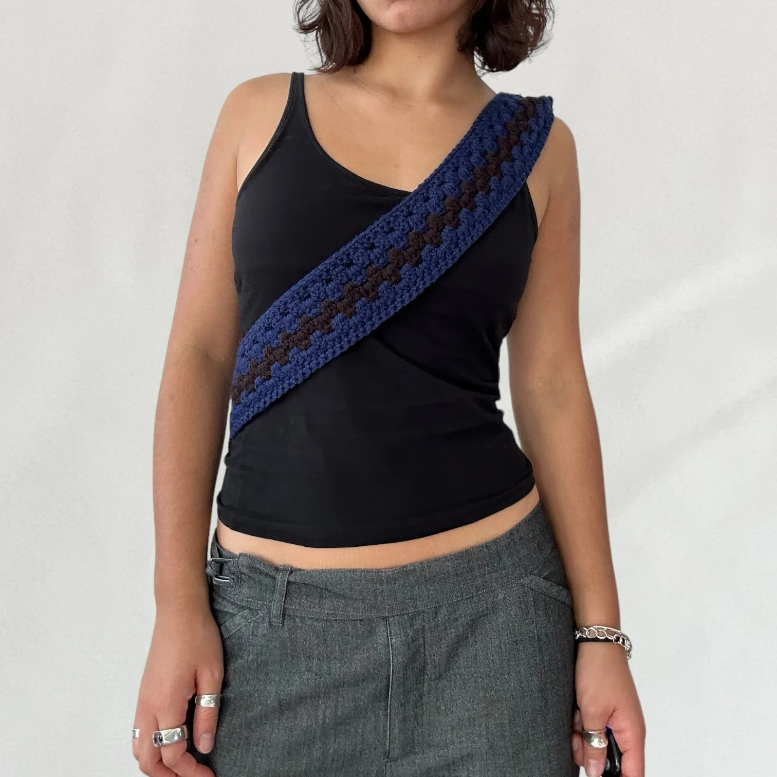 Blue and brown Miu Miu crochet wrap belt, can alternatively be worn as a scarf or sachette