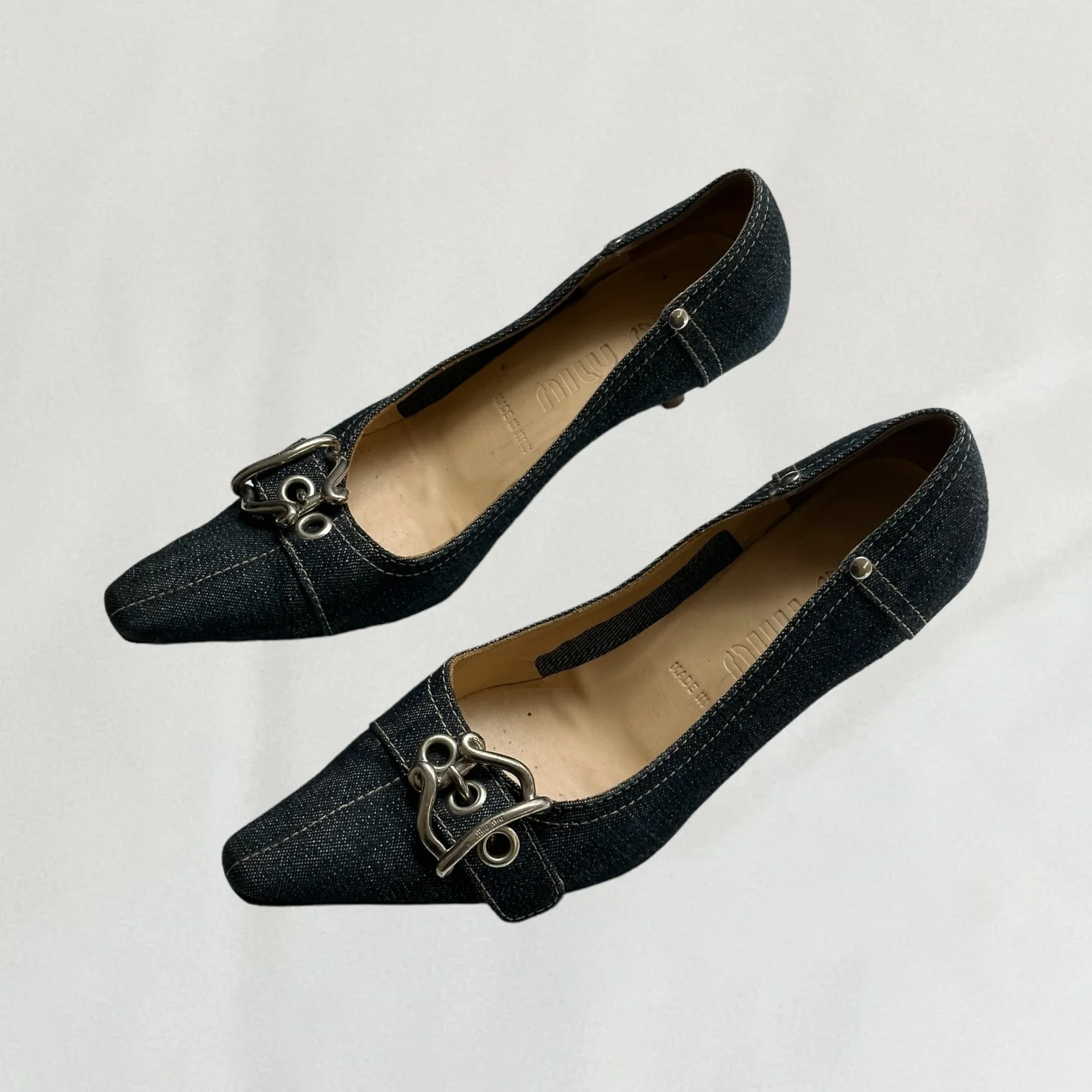 Denim Miu Miu kitten heels with buckle detail